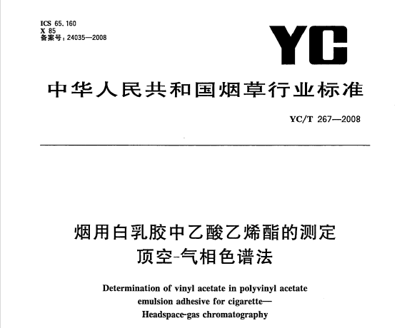 YCT 267-2008 煙用白乳膠中乙酸乙烯酯的測定頂空-氣相色譜法 YC/T267-2008煙用白乳膠中乙酸乙烯酯的測定頂空-氣相色譜法 本標準規(guī)定了煙用白乳膠中乙... 更新日期:2020-05-09 下載包(1)