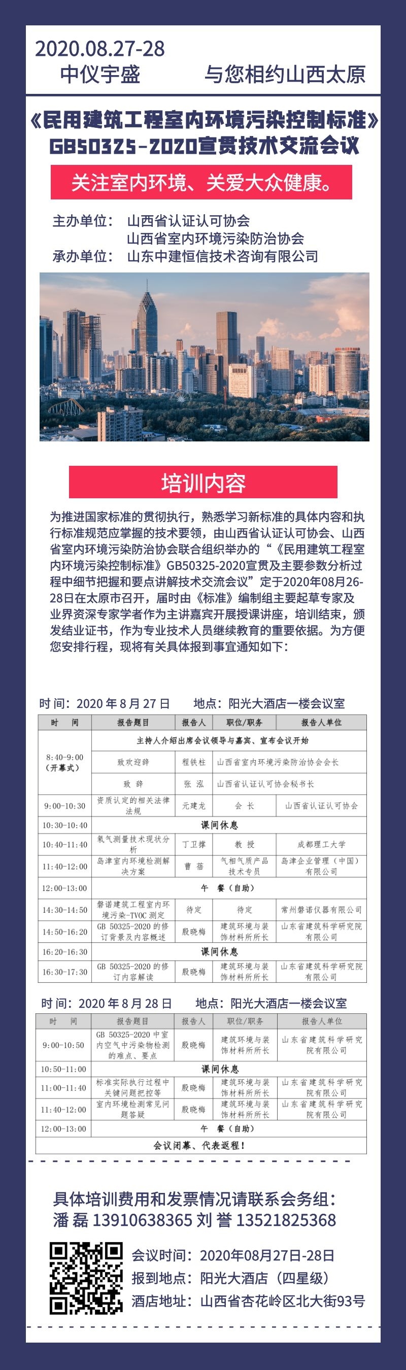 關注室內(nèi)環(huán)境、關愛大眾健康。相約太原!《民用建筑工程室內(nèi)環(huán)境污染控制標準》GB50325-2020宣貫技術交流會議 更新日期:2020-08-26